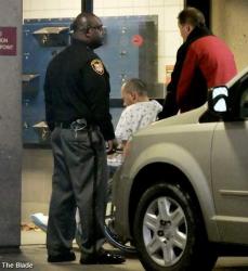 Mr. Skelton was brought to the Lucas County Jail about 3:25 p..m. He arrived in an unmarked van with tinted rear windows. He was wearing a hospital gown and was seated in a wheelchair. He was surrounded by law enforcement officials, some of whom chased reporters from the area.