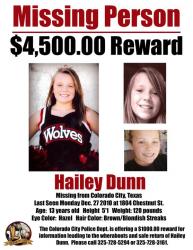 COLORADO CITY, Texas -- Officials with the city of Colorado City tell KTXS News that the reward has been upped from $10,000 to $25,000 for the return of missing teen Hailey Dunn.
